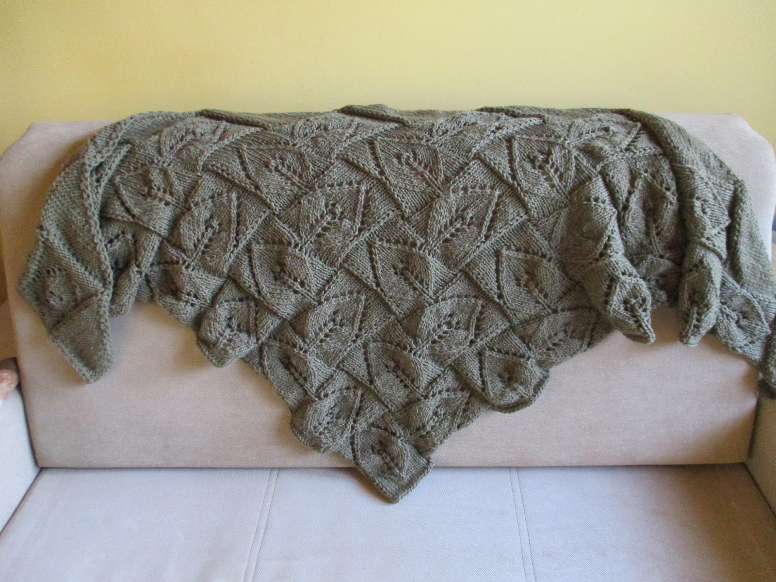 Za oknem środek lata ( u mnie ma być 29 stopni) a ja robię gruba , zimową chustę a właściwie już ją zrobiłam. Wełna leżała od 2 lat i ciągle było coś innego d zrobienia ale postanowiłam ze wreszcie ją zrobię i będę miała "z głowy". Nie jest duża, w sam raz do płaszczyka na te nasze letnie zimy albo na jesienne wieczory.Co do koloru to słabo jest widoczny na zdjęciach, ale to zgniła zieleń.
